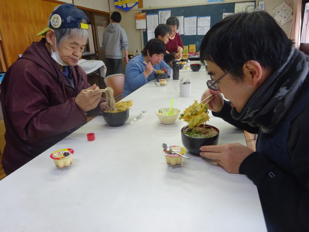 12月の土曜日営業 2025.12.24 ほほえみ 昼食にそばを作りました。とても便利でおいしい地域のスーパー魚庄さんから、かき揚げを買ってのせましたせました。大根はコミ協さんから。ねぎは地域の農家さんから。おいしくいただきました。お代わりもありました。皆さん満足です。お仕事も集中して進みました。